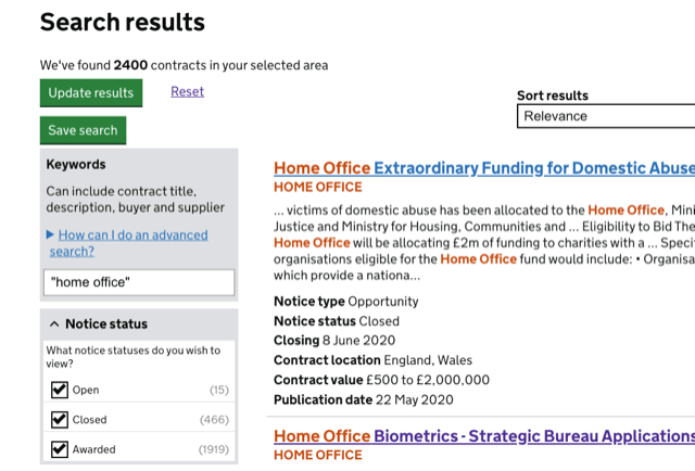 Post-February 2015, contracts are published on Contracts Finder. We searched for every contract on that database with “home office” in it. There were 2,400 results. Handily, these can be downloaded as CSVs and reformatted into Excel spreadsheets.
