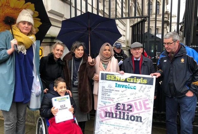 Image: Campaigners outside the gates of Downing Street earlier this year, submitting a giant invoice to the Government for SEND funding.