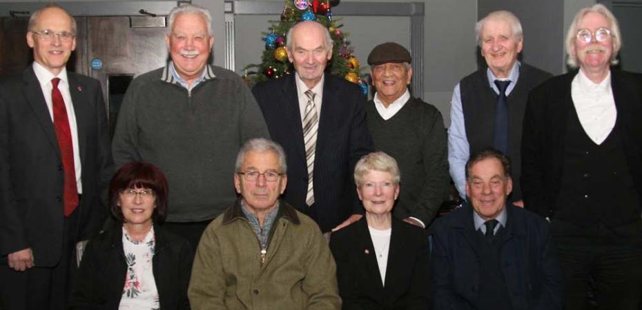 Image from the Shrewsbury 24 Camapign: Pickets and Campaign members come together to celebrate and prepare for the Court of Appeal hearing. Back row (L-R) Mark Turnbull, Terry Renshaw, Kevin Butcher, Michael Pierce, John Bohanna and Joe Sim; front row (L_R) Ann Dobie, John McKinsie Jones, Eileen Turnbull and Harry Chadwick.