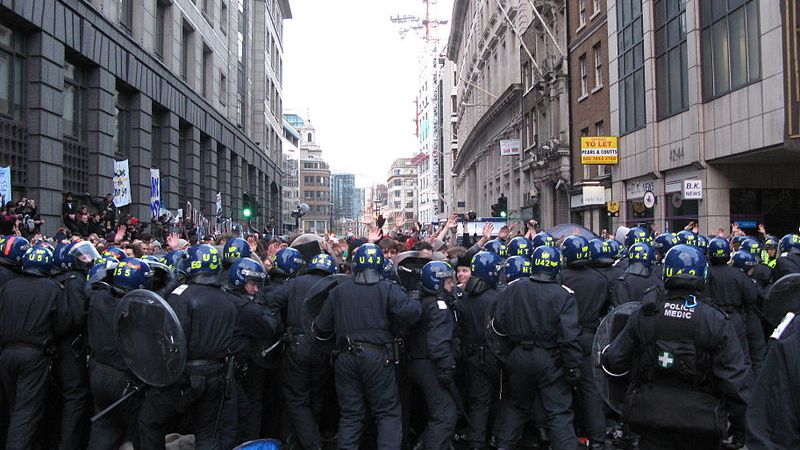 Image: Riot police officers “kettle” protesters at the Bishopsgate Climate Camp, London, 1 April 2009. Source: G20 protest, London, UK. Author: Charlotte Gilhooly from London, England, licensed under the Creative Commons Attribution 2.0 Generic license.