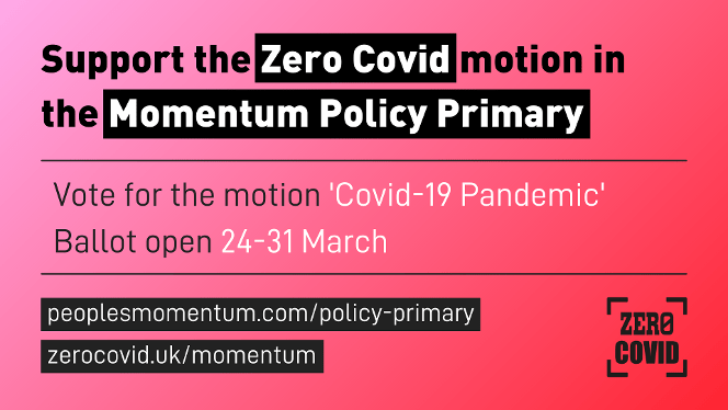 Voting in the Momentum Policy Primary is not the only way you can support Zero Covid. We are a grassroots activist campaign of individual supporters and affiliated organisations. Our supporters come from a range of political parties or none. Our aim is to build a movement to force UK policy makers to adopt an elimination strategy. Our structure allows for local groups to establish themselves and have a say in the running of the campaign. Coordinating our work centrally are teams of volunteers that cover areas such as social media, science and health advisory, press relations and mobilisation. We are part of the Zero Covid Coalition.