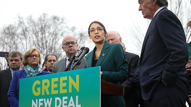 Image: Representative Alexandria Ocasio-Cortez (centre) speaks on the Green New Deal with Senator Ed Markey (right) in front of the Capitol Building in February 2019. Source: GreenNewDeal_Presser_020719 (26 of 85). Author: Senate Democrats, licensed under the Creative Commons Attribution 2.0 Generic license.
