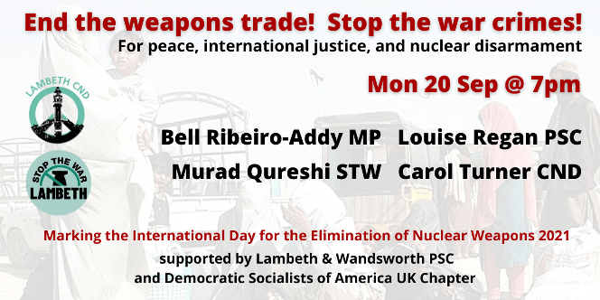 Join Bell Ribeiro-Addy MP and John McGrath from Democratic Socialists of America to discuss the issues raised, with Murad Qureshi from Stop the War, Louise Regan from Palestine Solidarity Campaign, and Carol Turner from CND. All welcome at this timely zoom meeting organised by Lambeth CND and Lambeth Stop the War, and supported by Lambeth & Wandsworth PSC and the UK Chapter of Democratic Socialists of America.