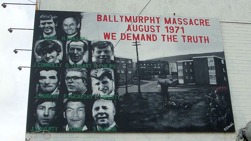 Image: A mural in Belfast, Ireland, commemorating the victims of the Ballymurphy Massacre in 1971. Source: https://www.flickr.com/photos/78918694@N00/2919917680/. Author: Flickr user “PPCC Antifa”, photograph of work by public artist R. Ó Murchú, licensed under the Creative Commons Attribution 2.0 Generic license.
