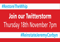 - Tweet in the Twitterstorm on Thursday 18th November at 7pm using the hashtags #ReinstateJeremy Corbyn #Restorethewhip