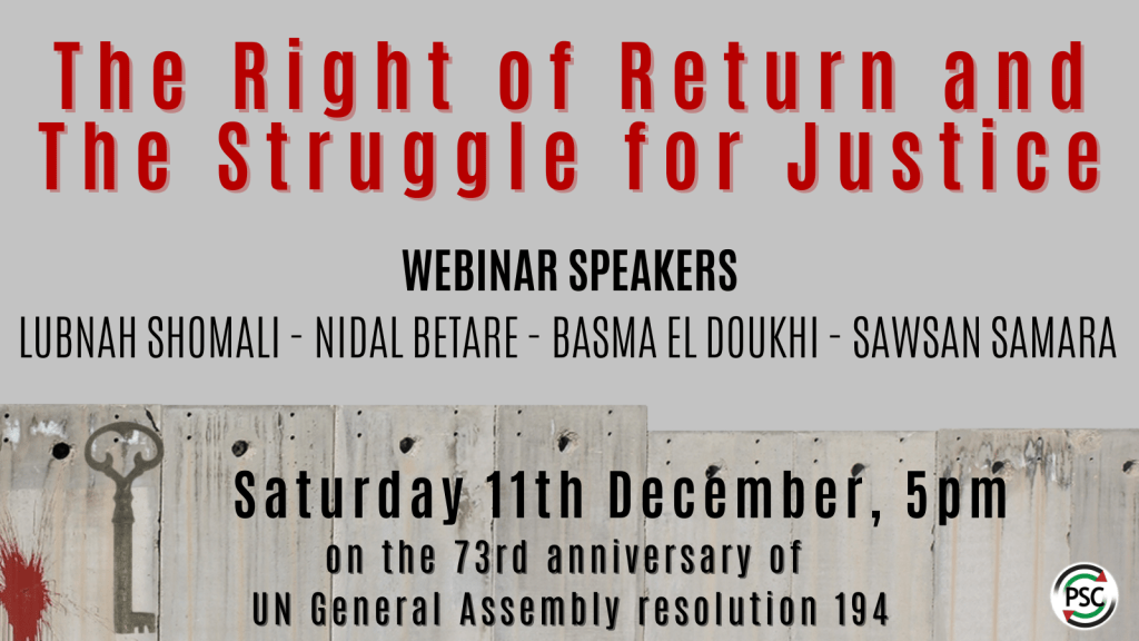 On Saturday, December 11th, the 73rd anniversary of the passing of UN General Assembly Resolution 194, which affirmed the Palestinian right of return, the PSC is hosting a webinar to hear from Palestinian exiles on their experiences, and learn how the right of return remains an essential part of the Palestinian struggle for justice. Register here