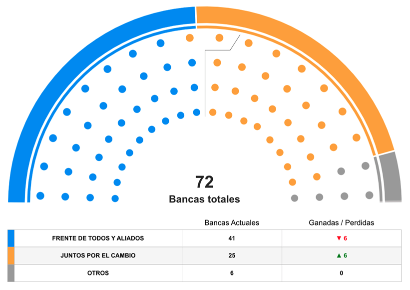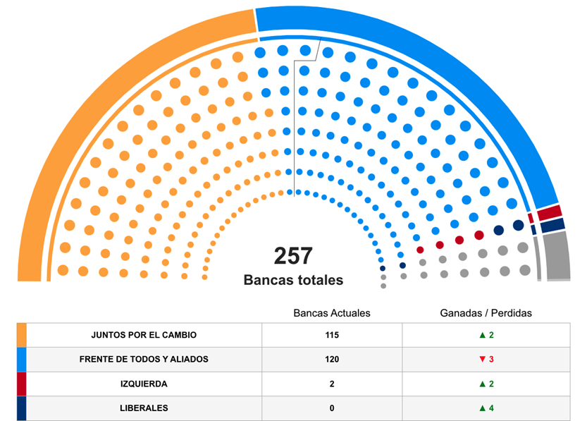 Of a total of 257 seats, Juntos por el Cambio now occupies 117, Frente de Todos and its allies 117, the left 4 and liberals 4. Frente de Todos (FdT) went from having 120 seats in the Lower House to 117, while Juntos por el Cambio renewed 60 seats, also leaving it at 117 – although allies for FdT might swing to 118 vs 116. The main opposition coalition managed to grow in the Senate and went from 35% to 43% while Frente de Todos fell from 57% to 48% of the seats. This leaves them without a quorum of their own, something that has never happened under a Peronist government.