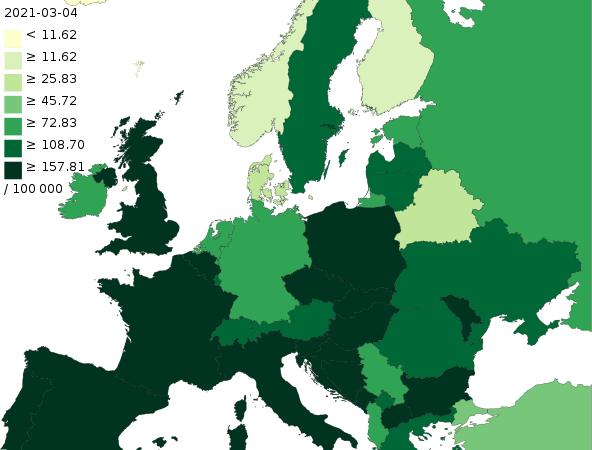 Image: Persons died due to coronavirus COVID-19 per population of the countries in Europe. Source: Map derived from Blank map of Europe (with disputed regions).svg