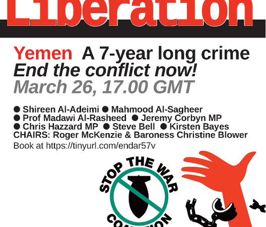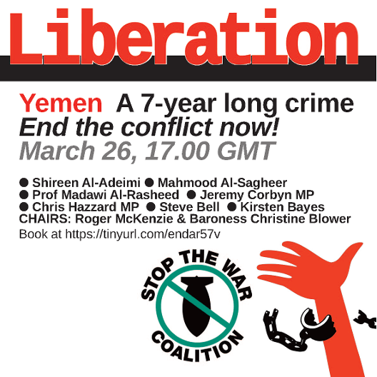 Liberation (formerly the Movement for Colonial Freedom) and the Stop the War Coalition will be holding a joint webinar to mark the seventh anniversary of the start of the disastrous war in Yemen, and calling for its immediate cessation, on Saturday March 26th at 17:00 GMT. For more information on this webinar and how to register, see here.