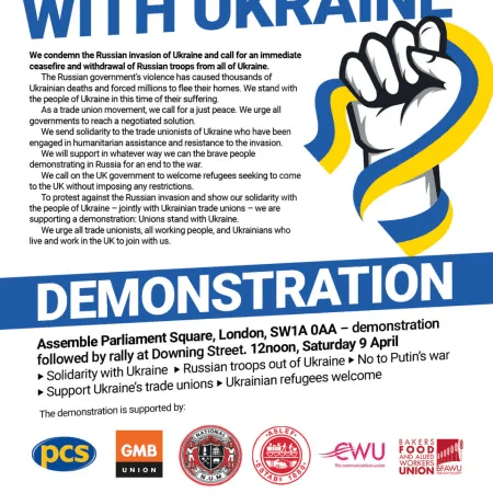 This Saturday 9th April, UK trade unions are mounting a protest march and rally in Whitehall, London, in solidarity with Ukraine. They will call for the withdrawal of Russian troops from all Ukrainian territory and an immediate ceasefire.