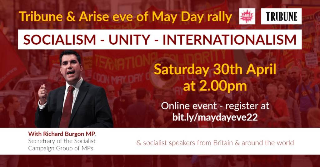 On Saturday 30th April at 2pm, thousands will start the May Day weekend by gathering for the “Socialism – Unity – Internationalism” online rally, co-hosted by Tribune and Arise Festival.