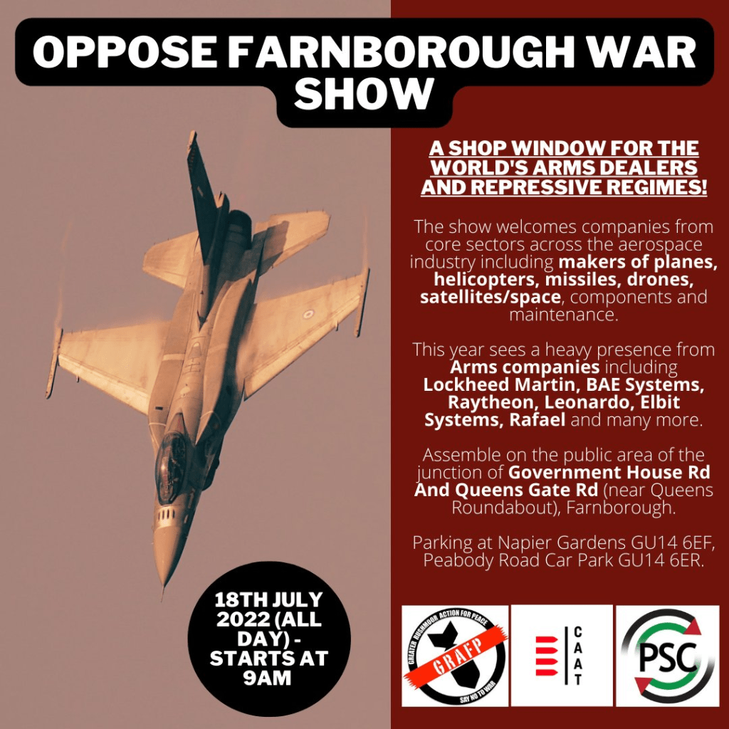 Oppose the Farnborough War Show: Join Greater Rushmoor Action for Peace, Campaign Against Arms Trade, and PSC to protest against the Farnborough war show, where companies arming Israel will be exhibiting. More information is available here.