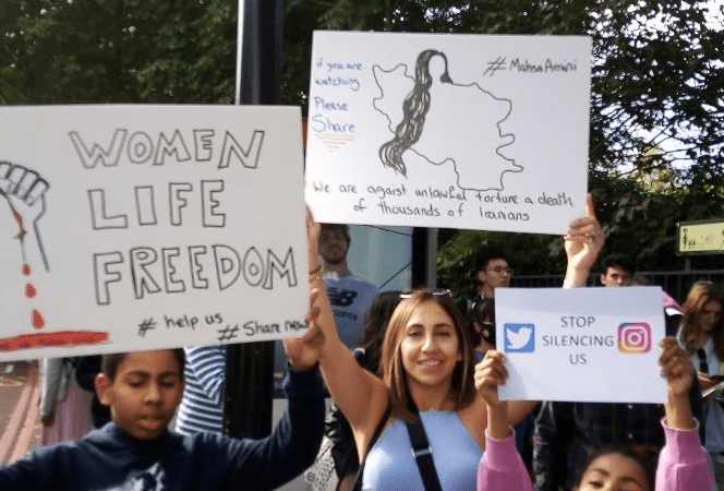 Photo: Protest in London in solidarity with the women-led uprising in Iran, c/o Mike Phipps