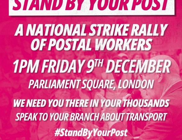 This Friday, 9th December, a strike day, the CWU is organising a national rally for postal workers in London. Supporters should do everything they can to assist with organising transport from around the country and attend the rally if they can. London postal workers – and supporters – will be marching from Mount Pleasant to the rally at Parliament Square.