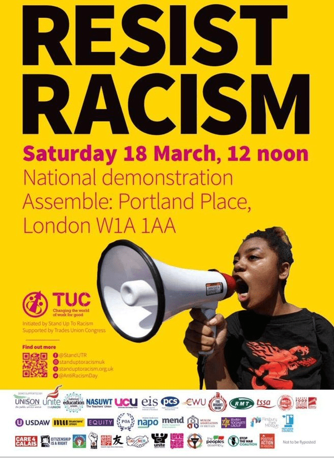 On Saturday March 18th there are huge #ResistRacism demonstrations organised by Stand up to Racism with the TUC and the support of dozens of organisations in London, Glasgow and Cardiff. You can sign-up and see more information here.