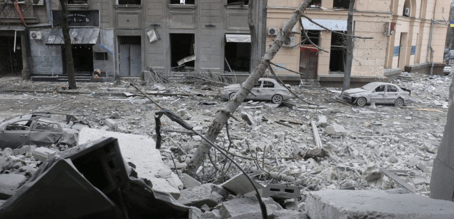 Image: Kharkiv downtown street destroyed by Russian bombardment. Source: https://www.facebook.com/photo/?fbid=321813666640956&set=pcb.321813919974264.Author: Міністерство внутрішніх справ України, licensed under the Creative Commons Attribution 4.0 International license.