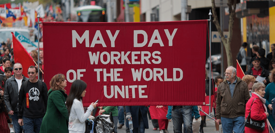 Image: May Day March in Melbourne. Source: May Day – Workers of the World Unite. Author: Johan Fantenberg, licensed under the Creative Commons Attribution-Share Alike 2.0 Generic license.