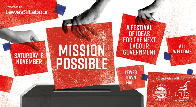 Mission Possible is a day to explore the ideas a Labour Government will need to effect the change 14 years of Tory misrule demand. Presented by Lewes Constituency Labour Party in association with Unite the Union South East Region, it’s the latest day of ideas, education and debate to be held at the historic venue of Lewes Town Hall. It’s scheduled for Saturday 18th November, ahead of the New Year onset of serious General Election campaigning.