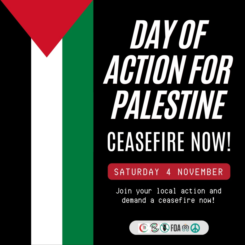 Activists in solidarity with the Palestinian people are promoting widespread local actions tomorrow, Saturday 4th November. In London, there will be a rally in Trafalgar Square at 2.30pm.