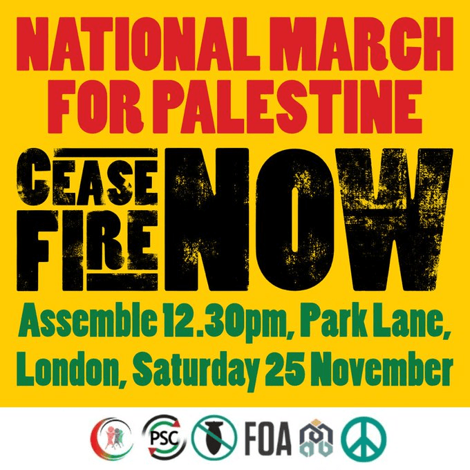 Demonstrate for a Ceasefire Now! Tomorrow, Saturday 25th November, 12.30pm, Park Lane, London.
