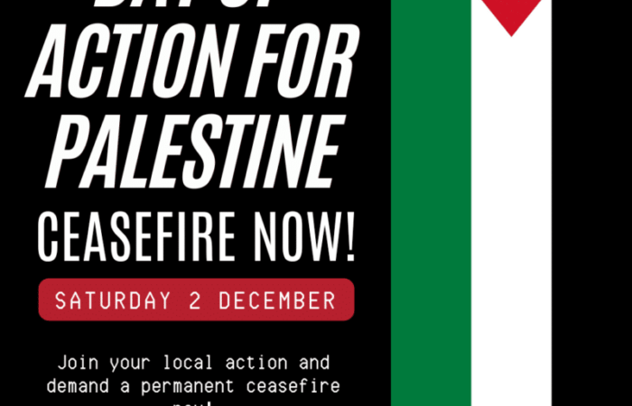 On Saturday 2nd December, join an action in your local area to call for a permanent ceasefire now. There are at least fifty local protests taking place tomorrow and more on Sunday: for your nearest activity, see here.