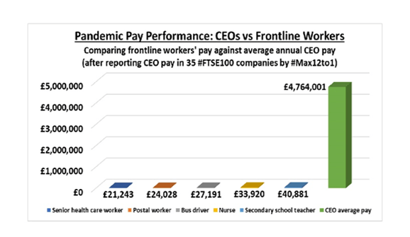 Returning to top pay, it is the sheer scale of executive excess that is hard to grasp but we had a go at conveying this. As we showed quite early on, after reporting 35 #FTSE100 companies, compared to frontline workers, CEO pay is almost off the graph.
