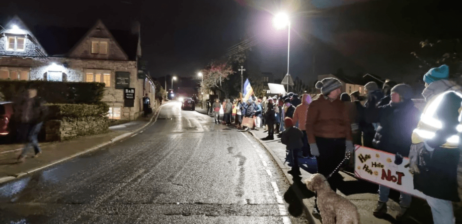 On the cold, dark early evening of January 11th, the Cotswold village of Whiteshill was brought to life with a colourful demonstration of shared values. Illuminated placards glowed in the night declaring the village a tolerant, refugee-welcoming and anti-racist community.