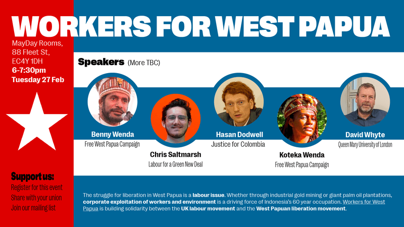 Workers for West Papua is a new initiative and we need your help to grow. You can start by attending our inaugural event in London on Tuesday 27th February 2024 (6pm at May Day Rooms, 88 Fleet Street). If you aren’t London-based, but are keen to be involved, you can get in touch to help organise an event where you live. You can also help by building support in your own union branch and beyond, including taking a model motion which we can provide.