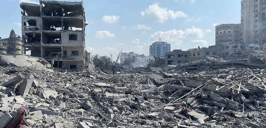 Image: Damage following an Israeli airstrike on the El-Remal aera in Gaza City on October 9, 2023. Source; Correspondence with Wiki Palestine (Q117834684). Author: Wafa (Q2915969) in contract with a local company (APAimages), licensed under the Creative Commons Attribution-Share Alike 3.0 Unported license.