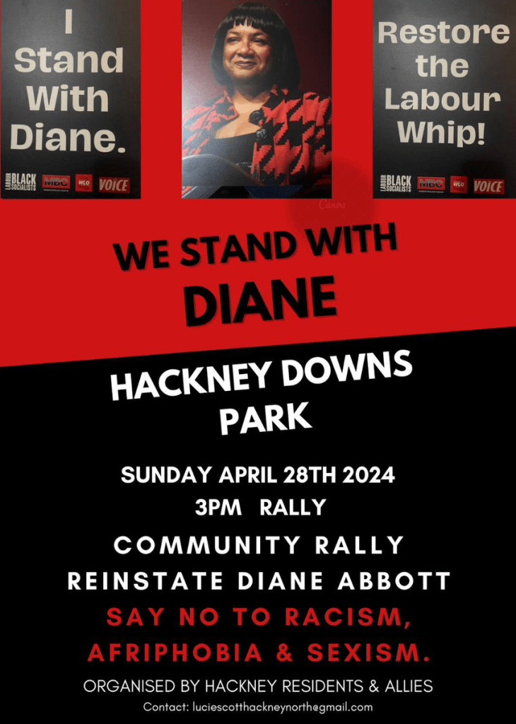 The Forde Report found there had been racism against Diane from senior Labour staffers but she has never received any apology from the Party. There have been public displays of support for her and another rally is planned for this Sunday, April 28th, at 3pm, Hackney Downs.
