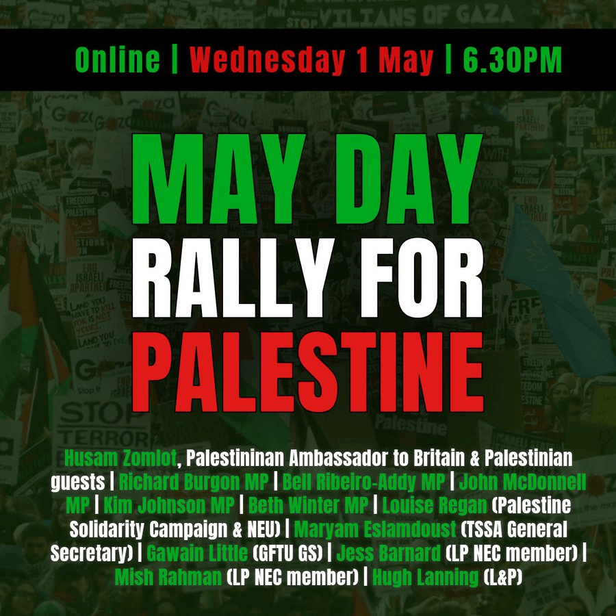 Alongside our major May Day rally online which will be addressed by the Palestinian Ambassador, the Stop the War Coalition have called a range of workplace actions, Workers for Palestine have activities planned and then next Saturday there will be another national day of action called by the Palestine Solidarity Campaign and others.