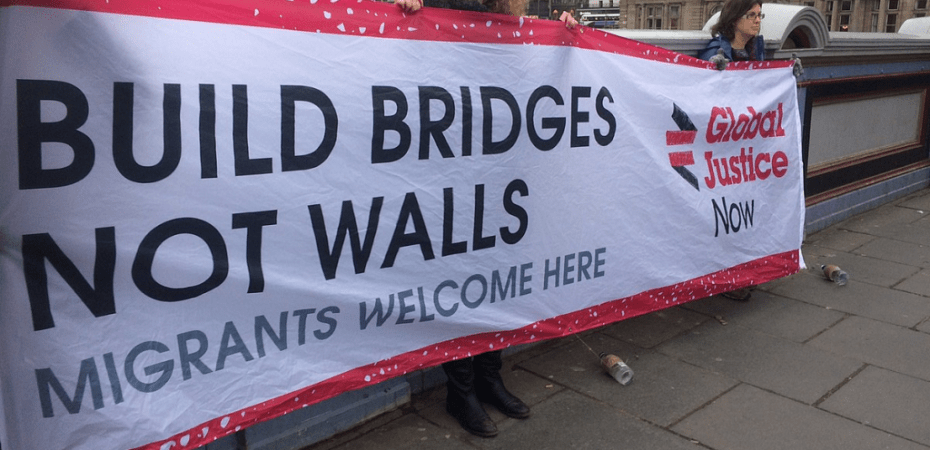 Image: Migrants welcome here GJN banner. Author: Global Justice Now, licensed under the Creative Commons Attribution 2.0 Generic license.