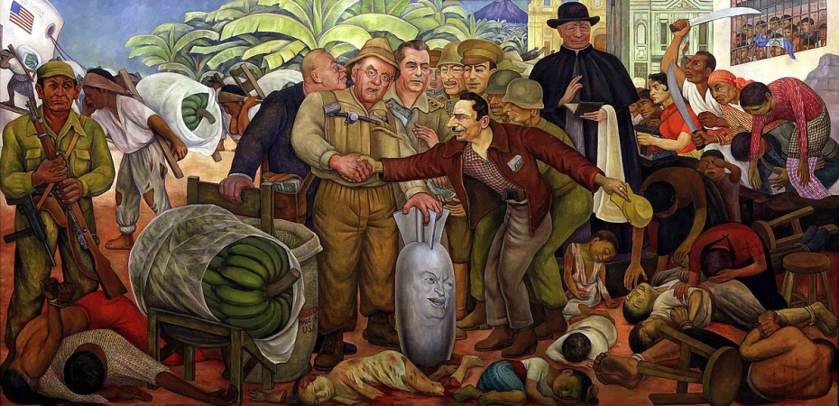 Image: The painting ‘Gloriosa Victoria’ by Diego Rivera depicts the story of the 1954 coup. Colonel Carlos Castillo Armas greets US Secretary of State John Dulles, who holds a bomb with the face of Eisenhower. CIA director Allen Dulles is shown whispering in his brother’s ear.