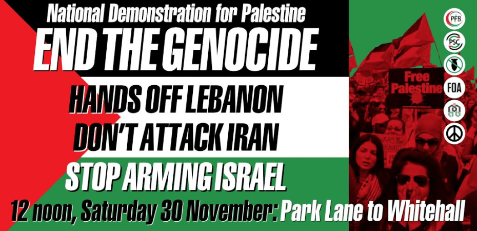 End the genocide! Demonstrate Saturday 30th November, 12 noon, Park Lane.