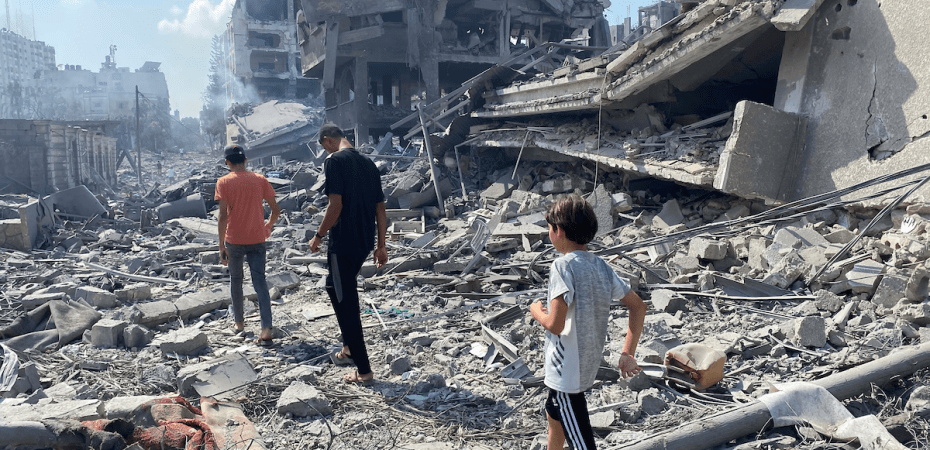 Image: Palestinians inspect the damage following an Israeli airstrike on the El-Remal aera in Gaza City on October 9, 2023. https://commons.wikimedia.org/wiki/File:Damage_in_Gaza_Strip_during_the_October_2023_-_26.jpg Source: Correspondence with Wiki Palestine (Q117834684) Author: WAFA (Q2915969) in contract with a local company (APAimages), licensed under the Creative Commons Attribution-Share Alike 3.0 Unported license. Attribution: Palestinian News & Information Agency (Wafa) in contract with APAimages