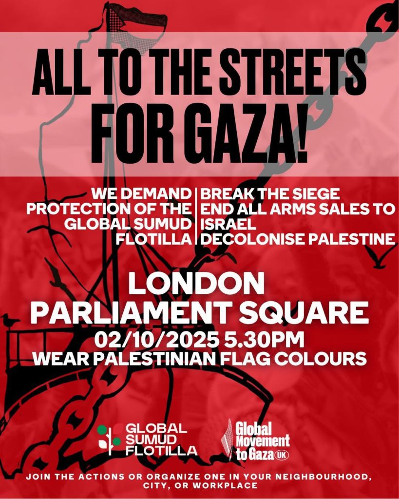 Last night the Global Sumud Flotilla, over 40 boats carrying international aid to Palestinians in Gaza, was illegally intercepted by Israeli forces. 443 volunteers from 47 countries were unlawfully seized in international waters. Participants were hit with water cannon and doused in sewage. Protests against this illegal act have been mounted around the world. The largest trade union in Italy is calling a general strike. Here, it is crucial that the Government act to protect British nationals, ensure their safety from harm and illegal detention, and order all detainees’ immediate release from captivity. These are ongoing violations of international law and the UK government must stand up to them – email your MP today!
