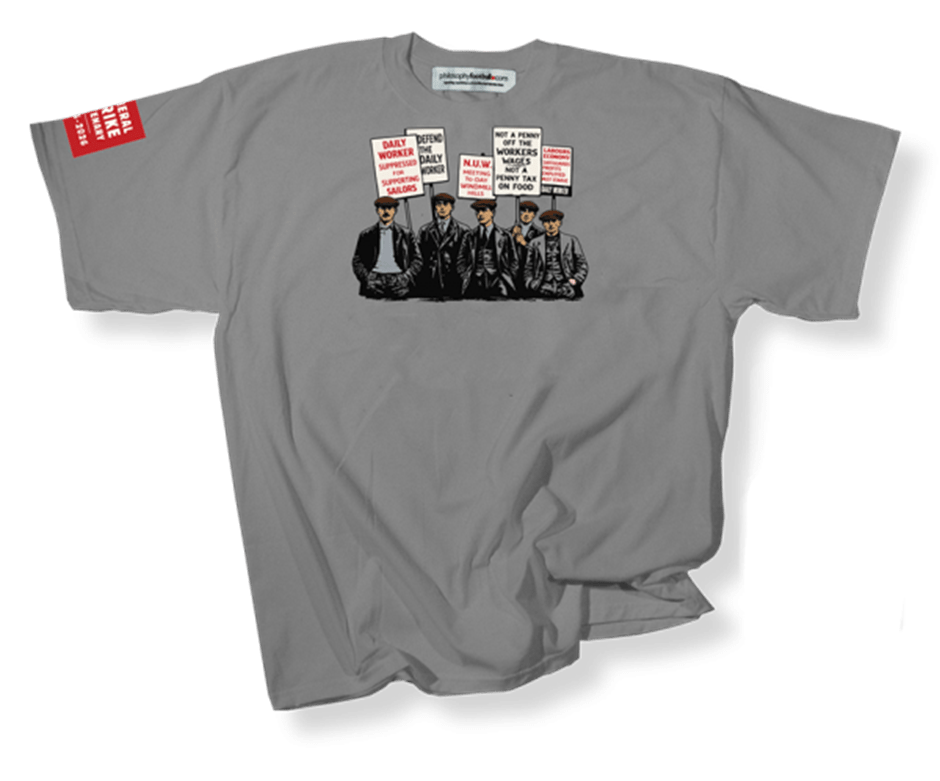 Philosophy Football’s unique centenary design takes an iconic black and white photo of a 1926 picket line and adds colour for the memories.